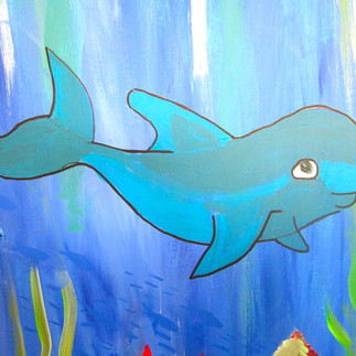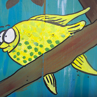 The piece would have a story line rather than a random collection of underwater sea- creatures and cartoons. The centre piece being a ‘Nemo’ type fish, hiding in the mouth of a much larger and fiercer fish who is following a very Scottish looking worm (worrem”) on a hook. This was suggested by the lead artist and mentor who had a very strong Scottish accent, and made everyone laugh at the Scottish pronunciation The nature of the game, as the title suggests is to find 7 cleverly hidden ‘Nemos’ tucked into various corners and crevices of the mural.